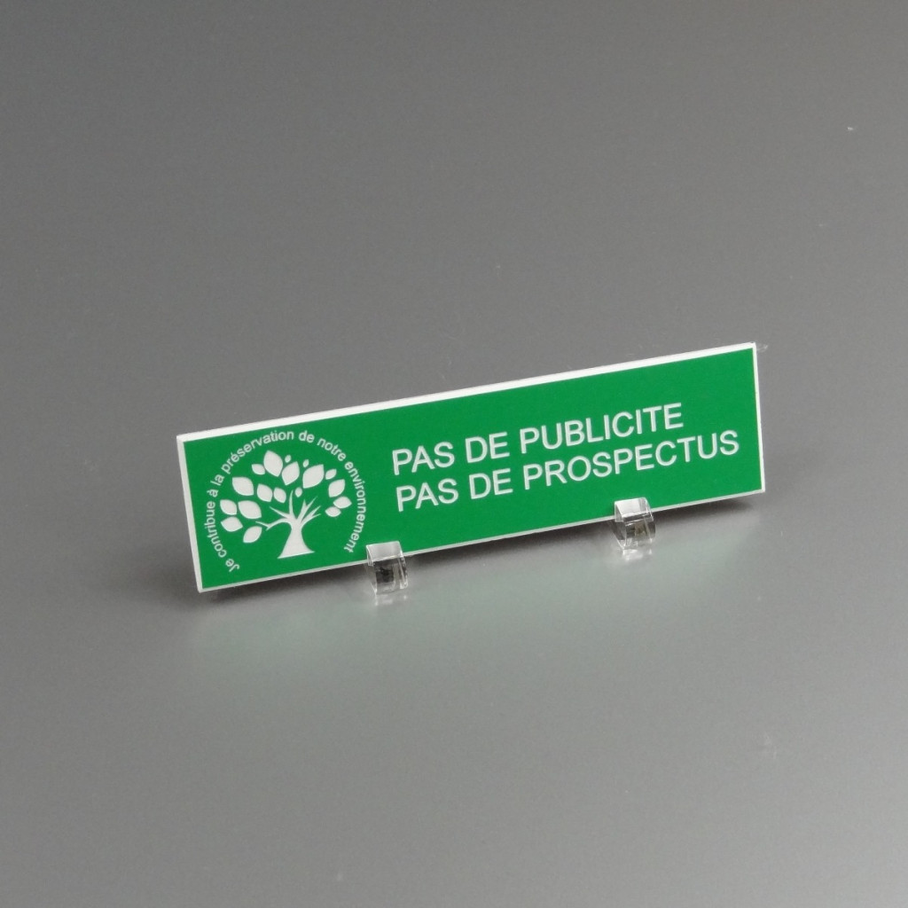 Plaque Stop Pub - je contribue au respect de l'environnement, gravée et découpée au laser dans un plastique bi-couleur de 1,5mm d'épaisseur (PMMA). Utilisable aussi bien en intérieur qu'en extérieur, résistant aux UV et aux intempéries. Ne décolore pas et ne s'efface pas. Nos plaques se posent aisément grâce au scotch double-face 3M fournis. Format 93x25 mm.